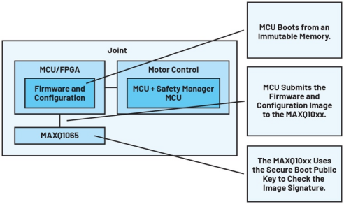 安全引导成功后,应用微控制器单元(MCU)/处理器/现场可编程门阵列(FPGA)可以读取认证器/协处理器的安全可配置存储器,以便选择性地启用关节/机器人控制器的功能。参见图9。