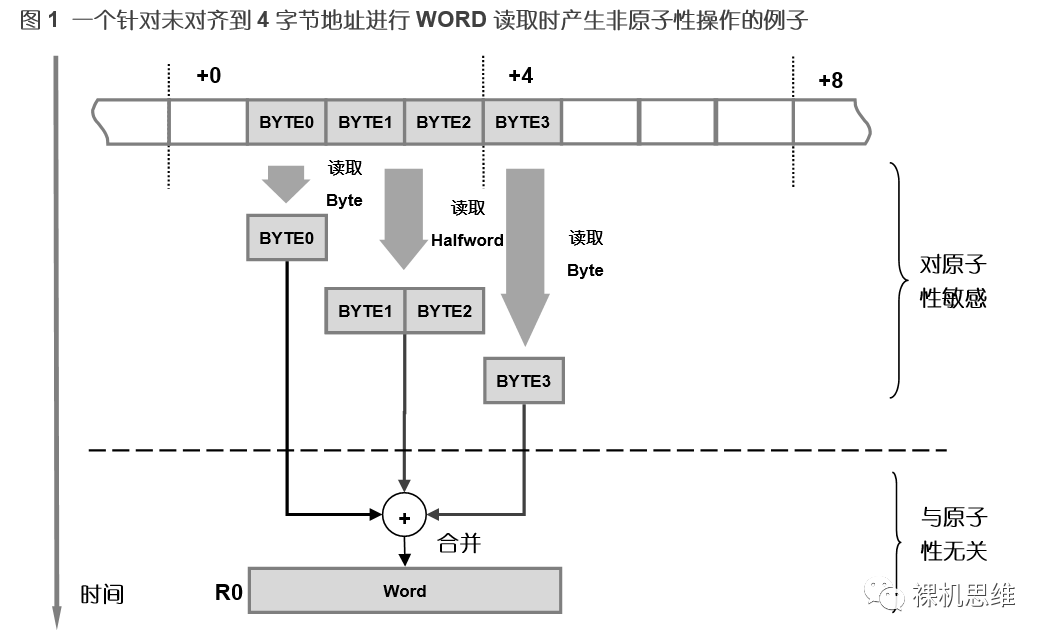 以32位机为例,对于图1所示的情形,由于32位数据的地址并未对齐到字,内核会将针对该数据的读写拆解成四个步骤:1)针对变量的第一个字节(8位)发起一个8位的读取;2)针对变量的第二和第三个字节发起一个16位的读取(它们正好对齐到了半字);3)针对变量的最后一个字节发起一个8位的读取;4)最后将三次获得的结果合并成一个完整的32位数据——针对该变量的操作由多个步骤构成,且中途有可能被打断,因而不具备原子性。