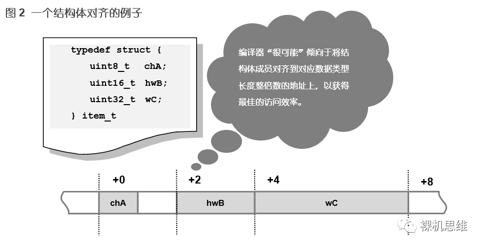 基于同样的原因,很多编译器为了提高内核的访问效率,在默认情况下,对结构体的变量采取了同样的策略——每个成员的地址都各自对齐到了与自己类型相同大小的位置上(如图2所示)——具体内容可以通过阅读《漫谈C变量——对齐》系列文章来了解,这里就不再赘述。
