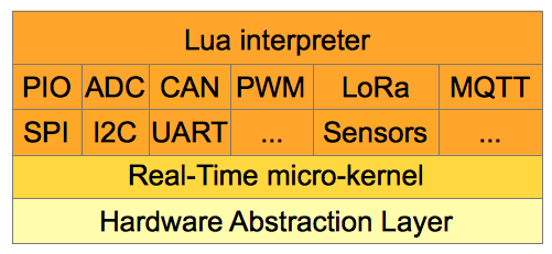 - 在顶层有一个Lua 5.3.4解释器,它为程序员提供Lua编程语言提供的所有资源,以及用于访问硬件的特殊模块(PIO、ADC、I2C、RTC等),以及Lua RTOS提供的中间件服务(Lua Threads、LoRa WAN、MQTT等)。