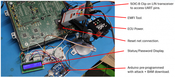 下图是在 NXP 汽车级芯片上的做的爆破演示,展示了绕过了芯片的安全启动,直接进入主程序,但攻击和理解结果的可移植性的想法适用于整个领域。