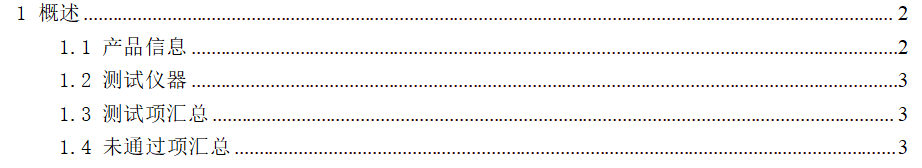第一部分主要包括以下内容,描述了硬件测试的软硬件版本信息,测试仪器,测试项目汇总以及未通过测试项汇总。