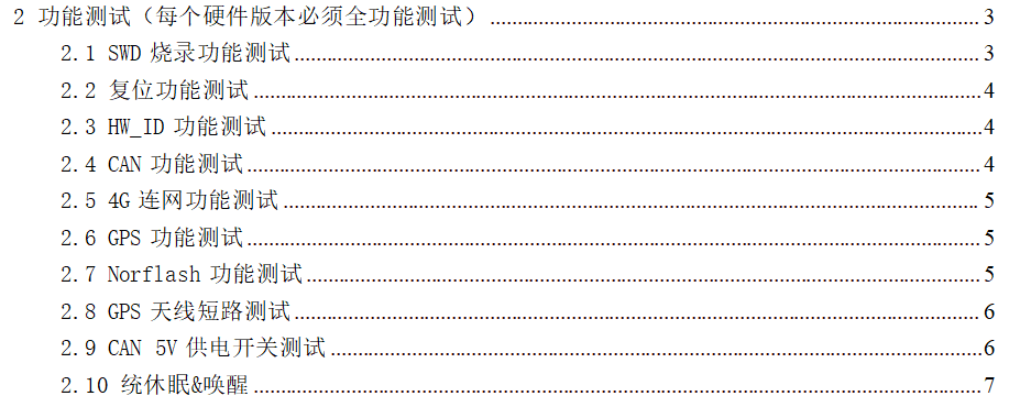第二部分主要包括以下内容,主要涉及单板各个功能测试项,包括SWD下载,复位、通讯功能,联网功能,定位功能等等。