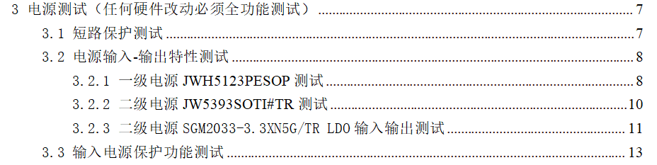 第三部分主要包括以下内容,包括电源的短路保护、过压保护,纹波,噪声、上下电测试,输出测试等等。