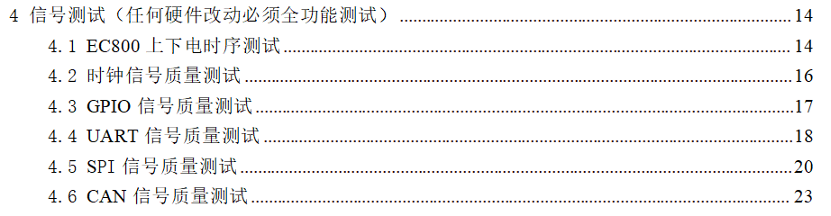 第四部分主要包括以下内容,主要涉及各个各个通讯,IIC、485、CAN、UART、时钟等的信号质量测试、还有小系统的上下电时序测试等等。