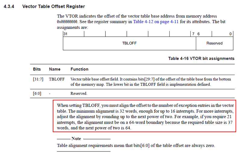 - Note: 比如项目中实际用到最大外设中断为 IRQ20,则最小向量表大小为(16 + 21)* 4 字节,那么向量表首地址需要至少以 0x100 对齐。