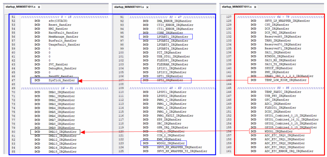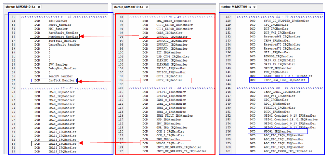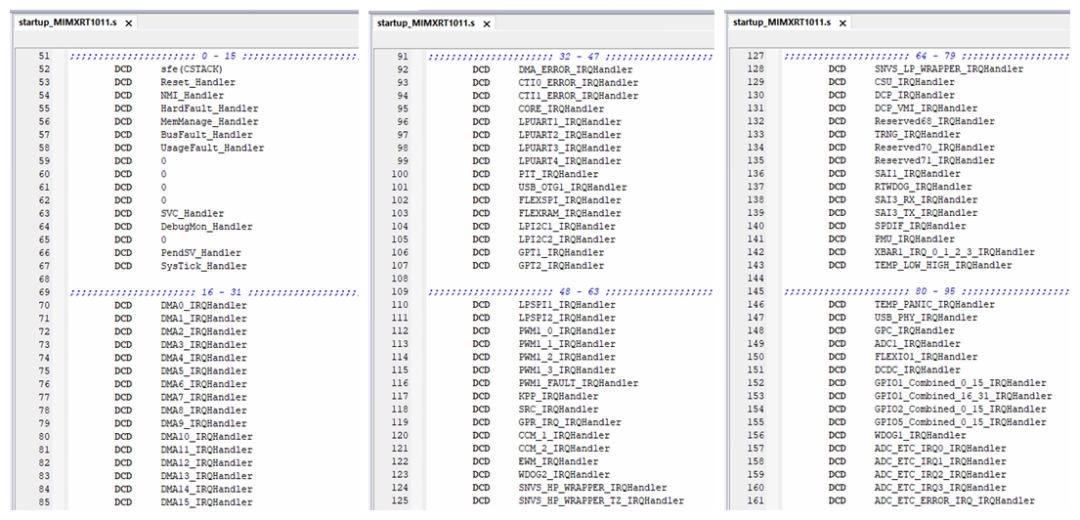 如果中断向量表首地址没有按规定对齐,会发生什么后果呢?我们找一块板卡来实测下,选择的芯片是恩智浦 i.MXRT1011,这是颗 Cortex-M7 内核的 MCU,除了 16 个系统中断外,还包含 80 个外设中断,中断向量表里一共 96 个有效中断,见如下 startup_MIMXRT1011.s 文件中具体中断响应函数定义: