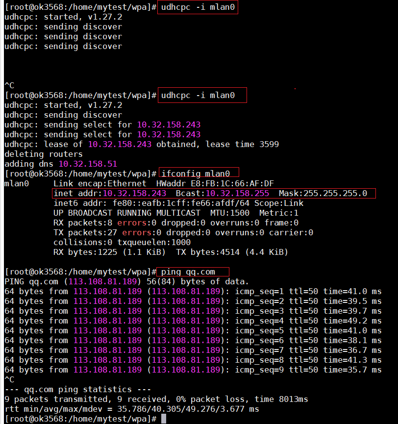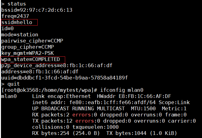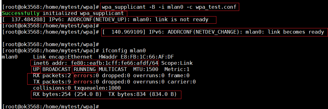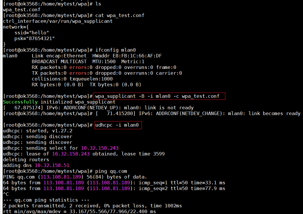 -B:后台运行-i mlan0:指定无线网卡(嵌入式常见wlan0,需根据实际调整,这里使用的mlan0)-c test_wpa.conf:指定配置文件路径