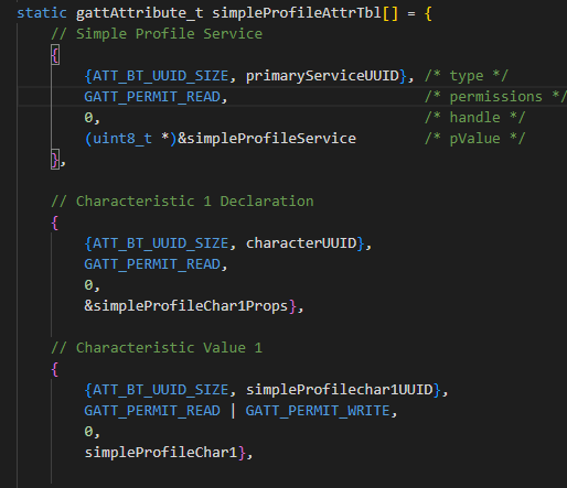 然后就是服务和特征值的配置,我们可以查看示例中的gattprofile.c 文件,里面有一个结构体数组 simpleProfileAttrTbl[] ,就是对服务和特征值的配置,如下图: