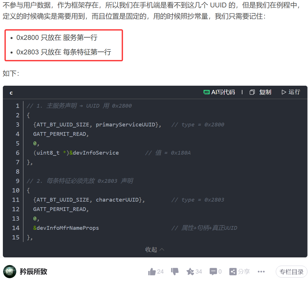 其中 0x 2800 和 0x2803 的 UUID 的问题在我以前的文章 一文搞清 BLE 蓝牙 UUID 有过说明 :