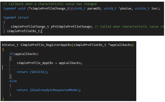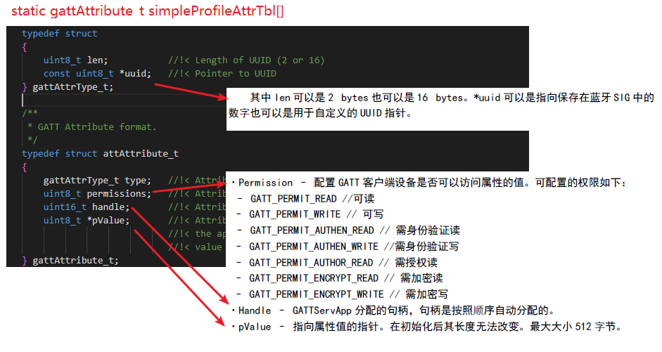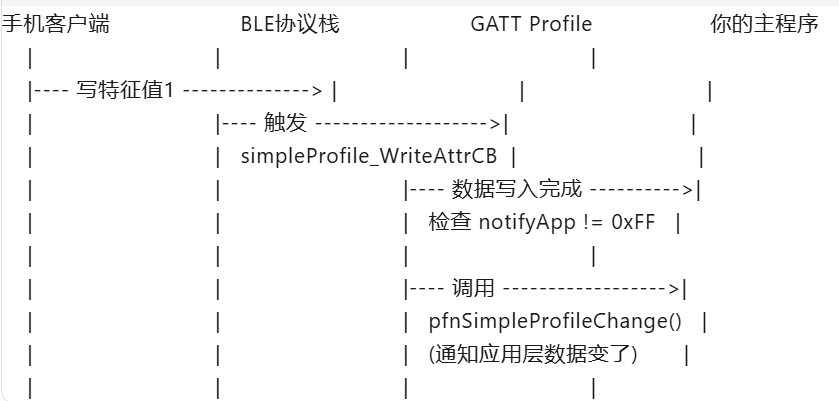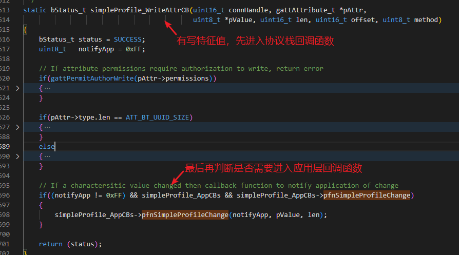 gattServiceCBs_t 类型的回调函数是协议栈层面的, 上面 simpleProfileCBs_t 是我们应用层面的。