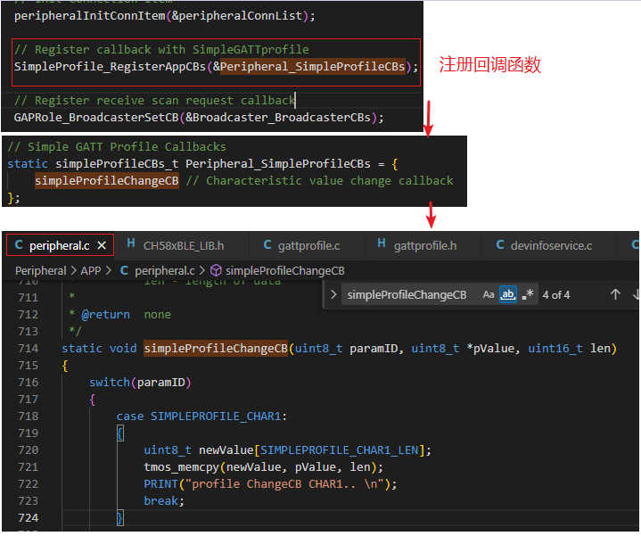 在 Peripheral 工程中,当 GATT 客户端写入特征值时后,通过一个名为 simpleProfileChangeCB 的回调函数,可以获取写入的数值。