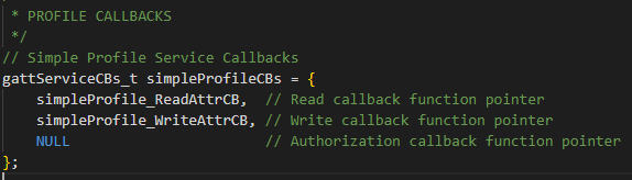 我们可以通过代码跳转,gattServiceCBs_t 跳转到的结构体是在库文件中定义的,我们应用层只负责绑定回调函数,其他操作库函数已经实现了,只要有特征值的读写操作,协议栈就会调用我们绑定的回调函数 (读操作 —> simpleProfile_ReadAttrCB 写操作 —> simpleProfile_WriteAttrCB ) 。