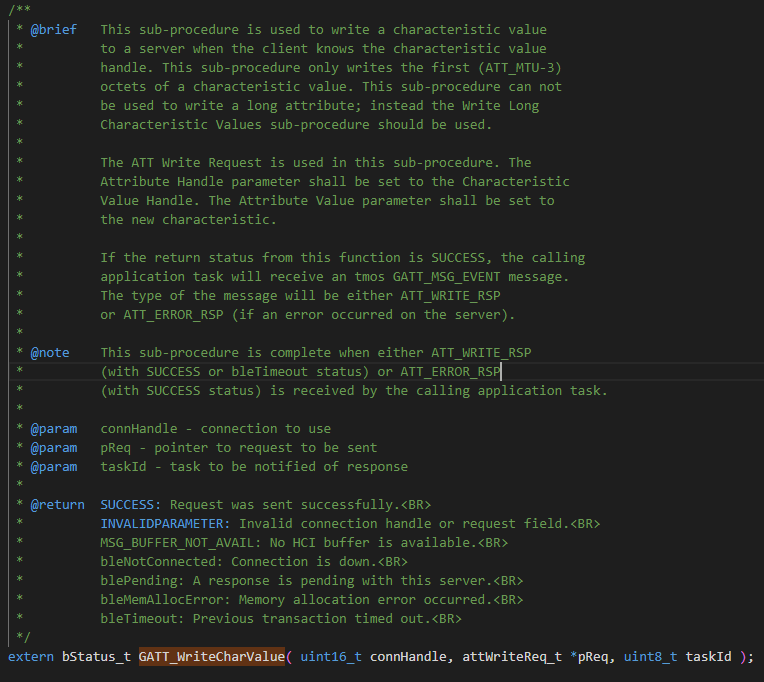 写特征值就是向 GATT 服务器发送数据,函数是库函数提供好的: