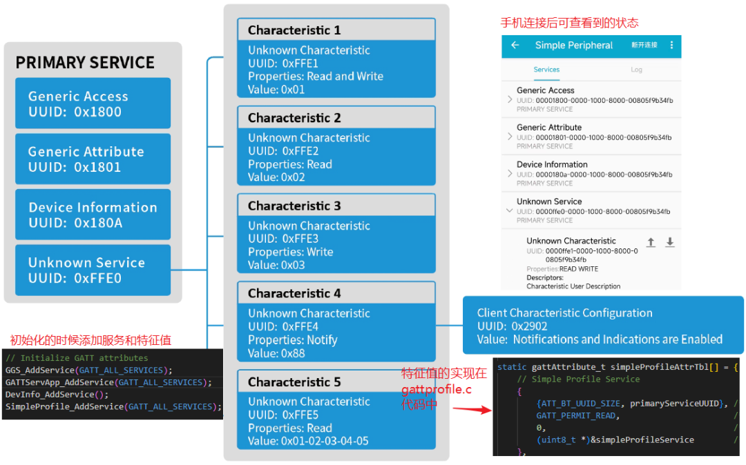 我们只要做过基础测试,手机与从机建立连接以后,就能够看到设备的服务和特征值,这些服务和特征值的实现都是在代码中有体现的,下面列出了示例中的服务和特征值: