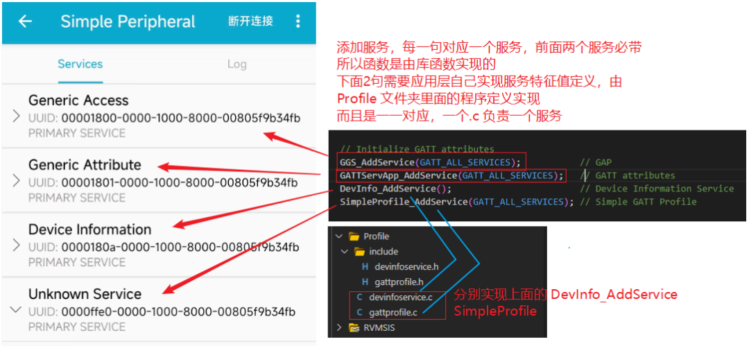 这里需要说明的是,我们看到从机示例的 4 个 服务 ,前面 2 个 UUID 为 0x1800 和 0x1801 的是必带服务,所有 Ble 设备都必须要有的。对于 CH58x 来说,这两个服务并不需要我们上层应用层去设计,因为已经封装在库里面了。从机示例的下面两个服务,都是需要我们应用层去定义的。