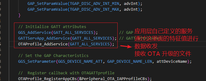 后面的代码,自己需要做什么应用服务,就自己添加什么服务,这个在官方的 蓝牙 OTA 代码中也有体现: