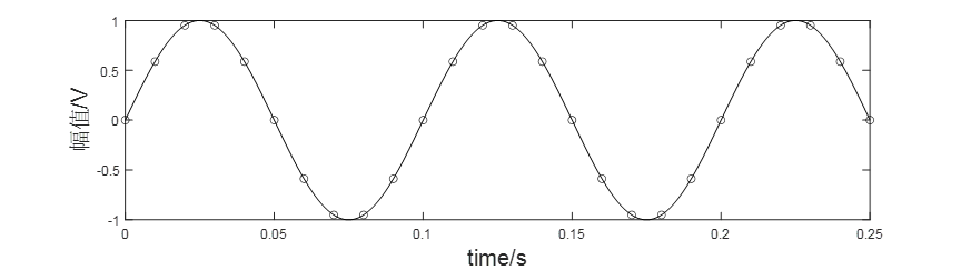 而画圆圈的点,就是一个一个离散的点,图中离散信号每个周期有10个离散的点,那么模拟信号被离散化的速率是10*10=100sps/s,也就是说每秒对模拟信号采样100个点,这就是采样率,图中一个周期的离散信号序列是:[0,0.59,0.95,0.95,0.59,0,-0.59,-0.95,-0.95,-0.59],有时为了显示方便,会把离散点用线连接起来,但是实际上点与点之间没有数,也不是0,比如第一个数0和第二个数0.59之间的数是多少?这是个没有意义的问题,0和0.59之间是没有数的,有同学说是0,其实也不是0,这就好比是在问:自然数1,2,3.。。。中,1和2之间是几?自然数是一个一个整数,自然数1和自然数2之间,没有其他自然数,所以1和2之间是几是个没有意义的问题。