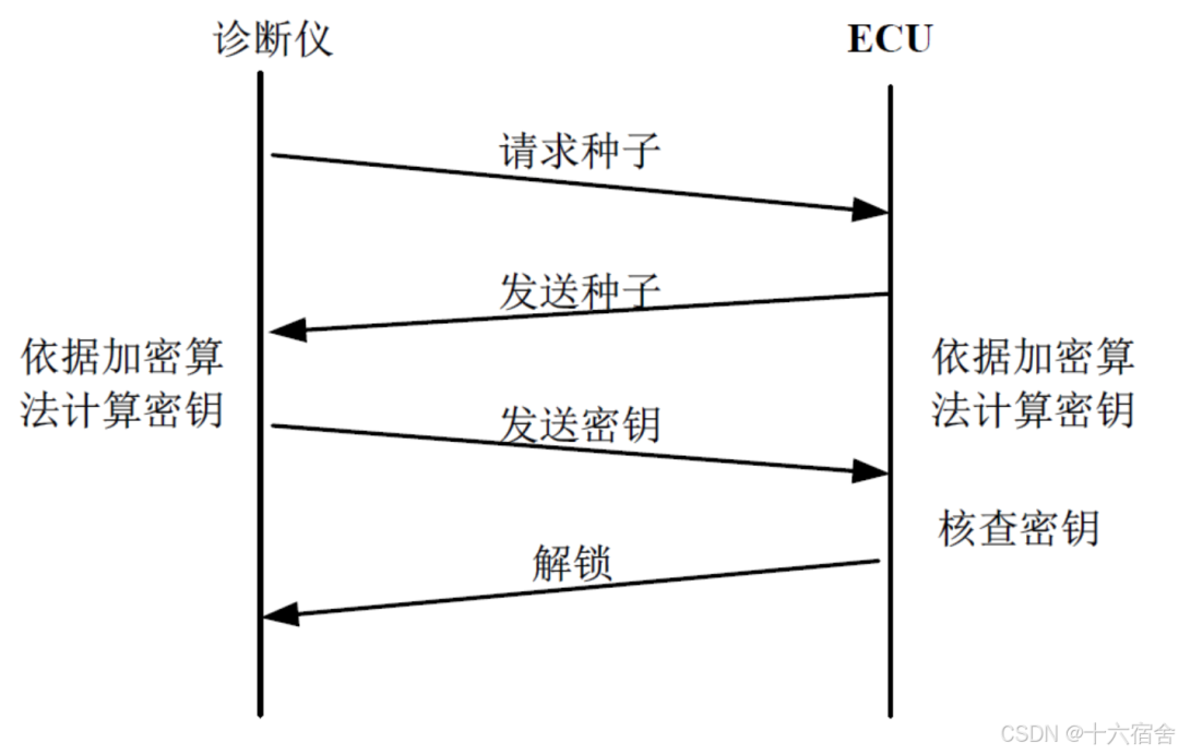 27服务它的核心目的是确保对车辆电子控制单元进行敏感操作(如刷写、参数修改)之前,必须通过一个安全验证过程,防止未授权的访问。诊断仪和ECU之间的交互如下所示: