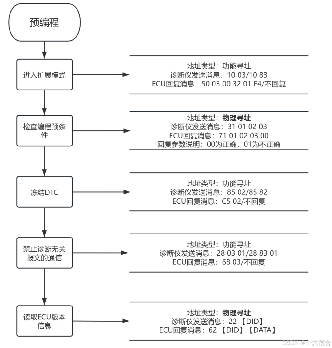 预编程阶段(Pre-Programming Phase):其为刷写操作准备环境,包括停用总线上ECU功能(如诊断通信外的其他服务),验证待刷写ECU当前状态(如电压、温度稳定性)是否可以刷写,以及将待刷写ECU进入BootLoader模式,等待主程序传输。