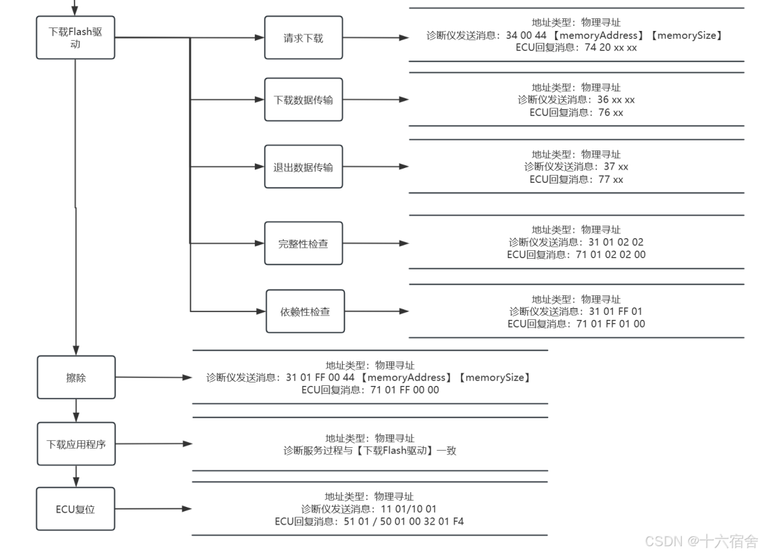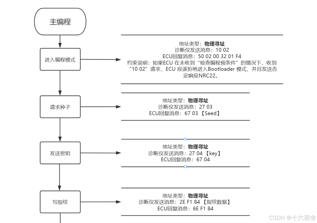 写完指纹之后,就开始下载流程了,先下载Flash驱动(下载到RAM,所以在现在之前不用擦除),然后再擦除,再下载“应用程序”(这个应用程序可以是实际的主程序,也可以是标定区,也可以是某些出厂写入的DID),最后ECU复位,完成主编程阶段。