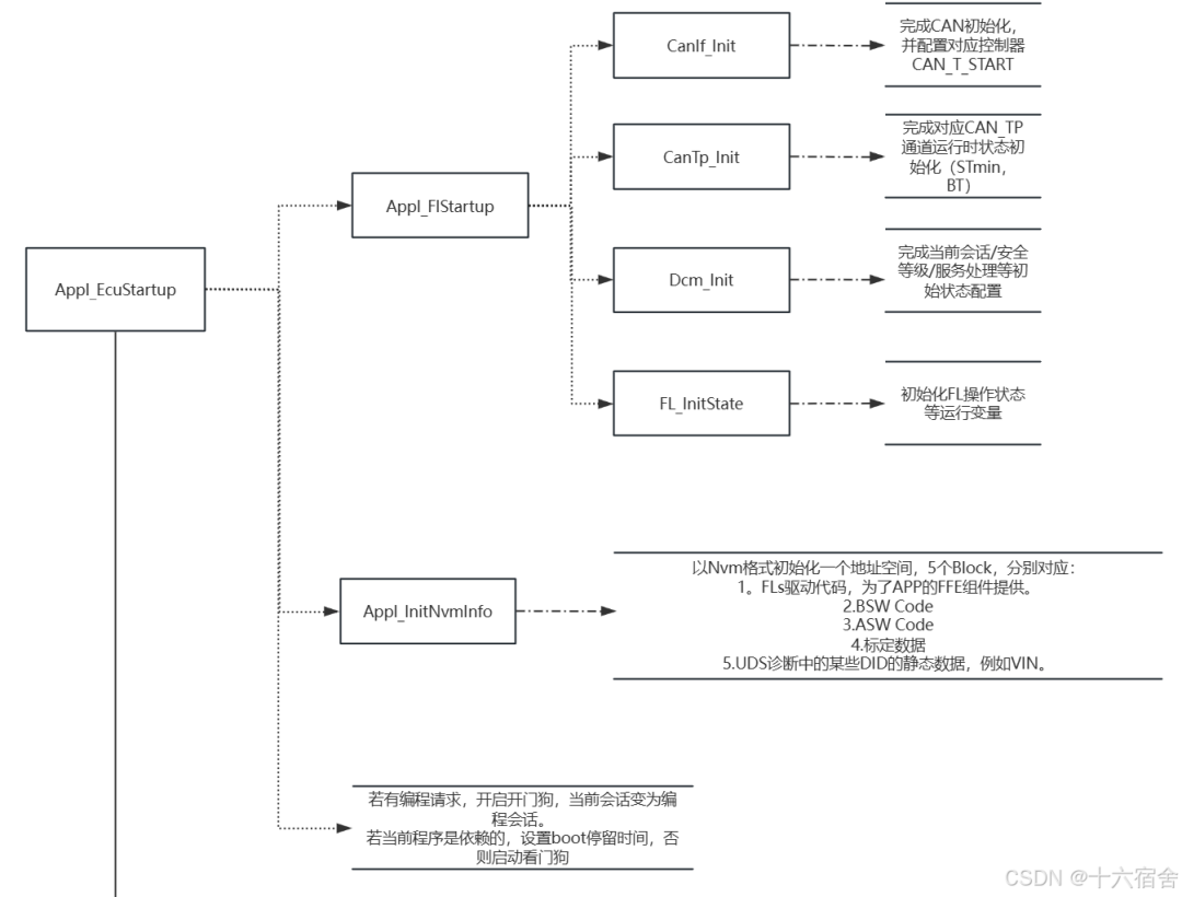 可以看到,Appl_EcuStartup在程序中只进行了一次,它的主要工作是完成必要的初始化以及进入Boot之前的状态读取,下面是它的各部分组成以及完成的工作说明。