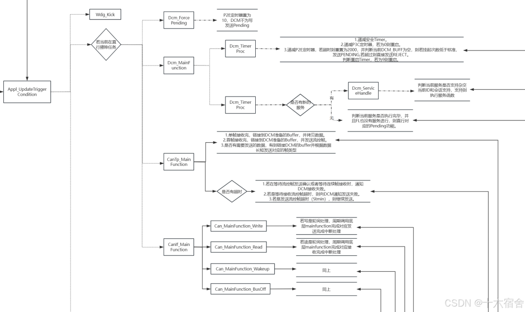 首先它判断了是否当前正在执行擦除任务,若在执行擦除任务,则调用Dcm_ForcePending,使Pending的发送不再归DCM负责,而由FL模块负责,并调用Dcm_MainFunction、CanTp_MainFunction、CanIf_MainFunction完成对应BSW模块的MainFunction调用,他们会根据需要调用对应驱动完成相应功能。下图详细的介绍了每个MainFunction包含的主要接口和对应完成的功能。