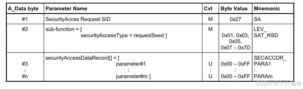 下图为ISO 14229-1对请求种子的对应协议格式说明。