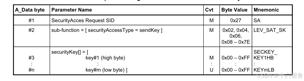 下图为ISO 14229-1对发送密钥的对应协议格式说明。