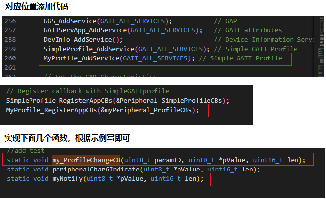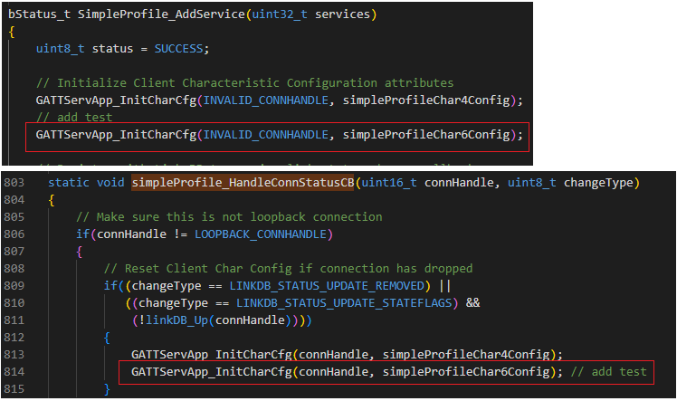 SimpleProfile_AddService函数对应位置添加绑定信息,然后对应几个地方也需要增加一条代码: