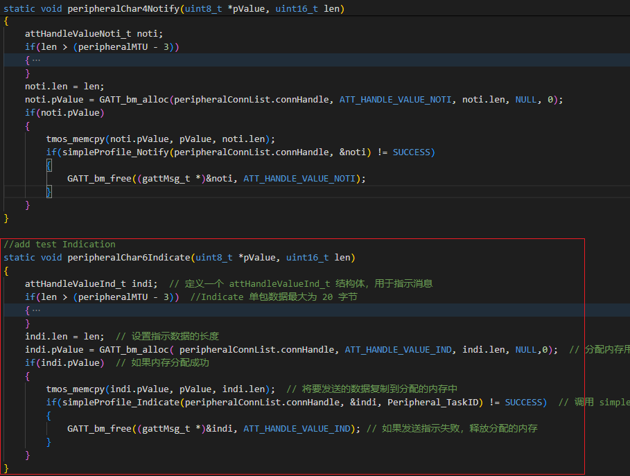 4. 4. 最后还需要在 peripheral.c 中实现一下 Indicate 发送,这个其实就是按照示例的 Notify 发送写就行了,没特别的: