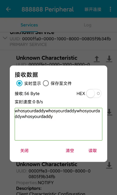 不过上面 nRF Connect 我还真不知道怎么读取显示成字符串,也没在网上找到如何设置,因为这个服务的第一个特征值我是用字符串处理的,使用沁恒微 的 Ble 调试助手可以读取显示字符串: