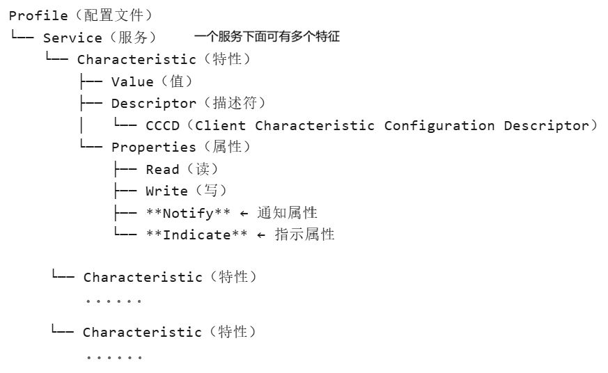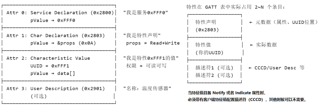 - • 特征值声明(Characteristic Declaration):说明这是一个特征值,包含它的属性(读 / 写 / 通知等)。