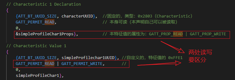 | simpleProfileChar1Props (特征属性,比如 GATT_PROP_READ) | GATT_PERMIT_xxx(访问权限,比如 GATT_PERMIT_READ) | |
