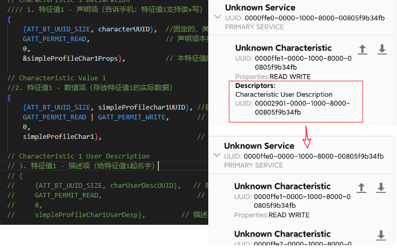 - • 特征值需要 0x2803(声明属性)+ 自定义 UUID(存数据)+ 0x2901(描述,可选),至少 2 项;