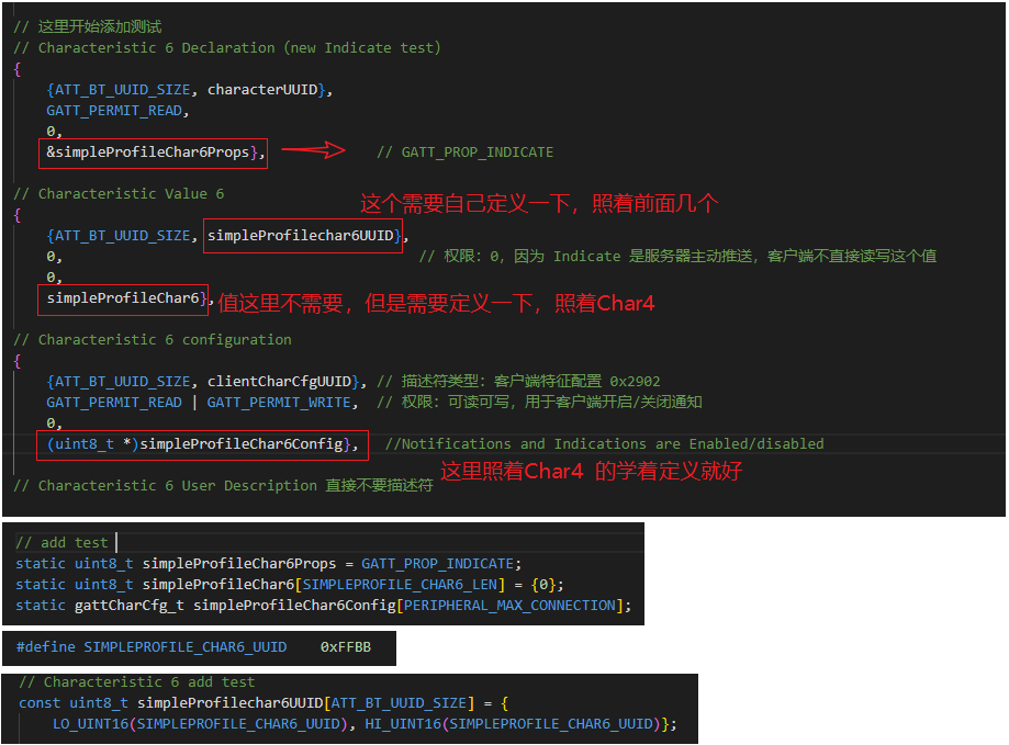 首先我们在示例基础上,增加一个带 Indicate 属性的特征值, 第六个特征值,直接在 simpleProfileAttrTbl 数组后面添加: