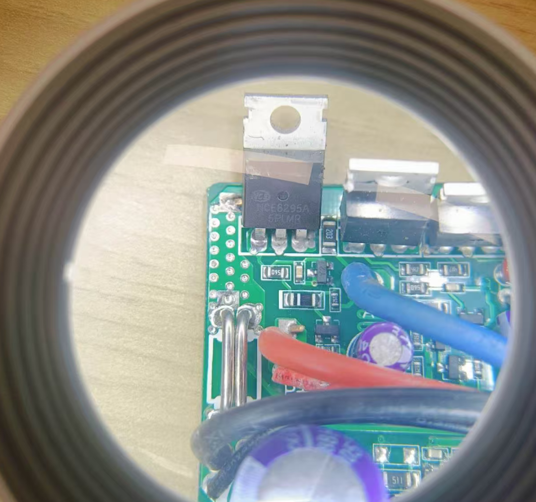 接下来是NMOS,丝印清晰可见,这是NCE(无锡新洁能)家的NMOS,型号NCE8295A,漏源电压(Vdss)82V,连续漏极电流(Id)92A,采用先进的沟槽技术和设计,可在低栅极电荷情况下提供出色的导通电阻RDS(ON)。该器件适用于脉冲宽度调制(PWM)、负载开关及通用应用。其导通电阻在栅源电压在10V时,可以到8毫欧,相当优秀了。