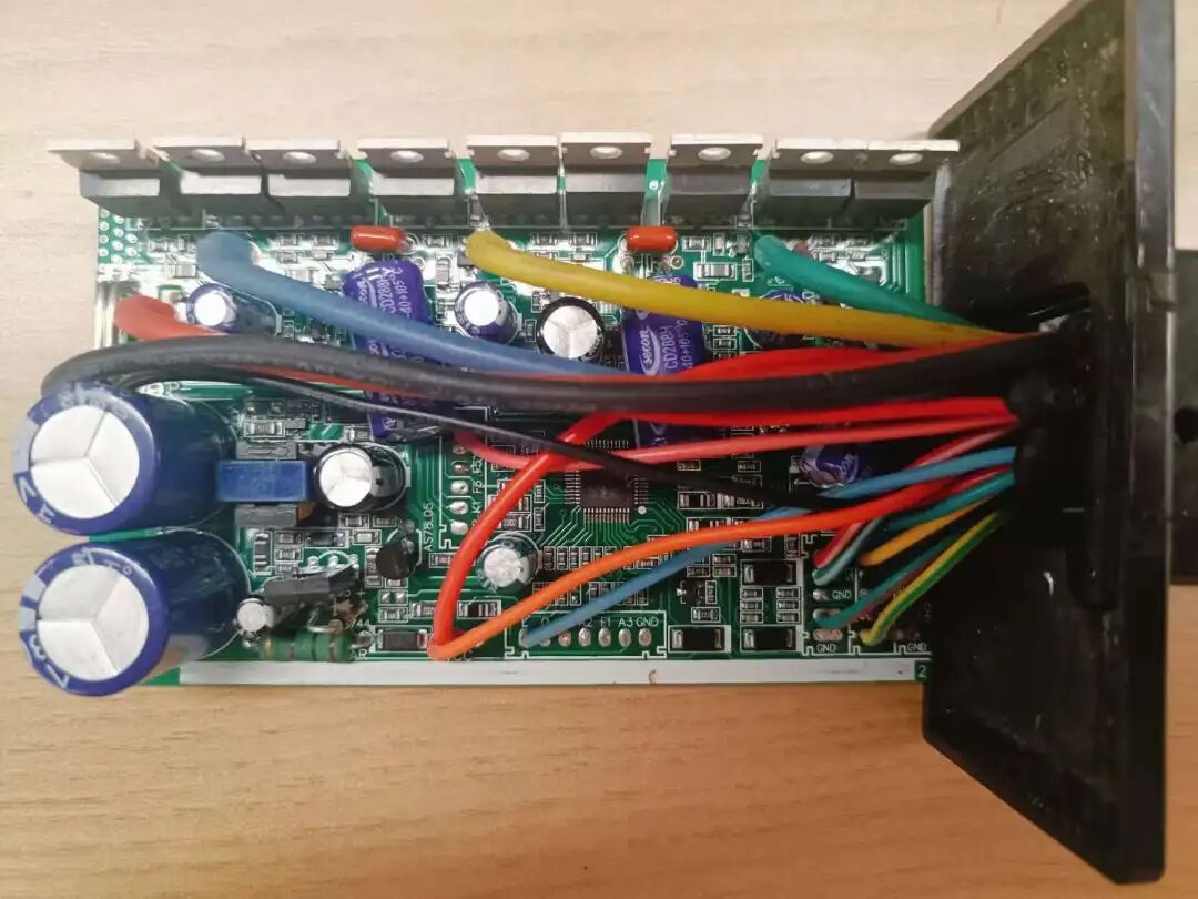 好,科普完,我们先来看一下这个控制器的全身照,线束还是比较多的,最下边的是整板电源供电线,另外一根红色的的接在了板子上的VCC,应该是对外输出的。中间的三根蓝绿黄是电机的三相线。上面两捆儿是电机上的各种控制线。