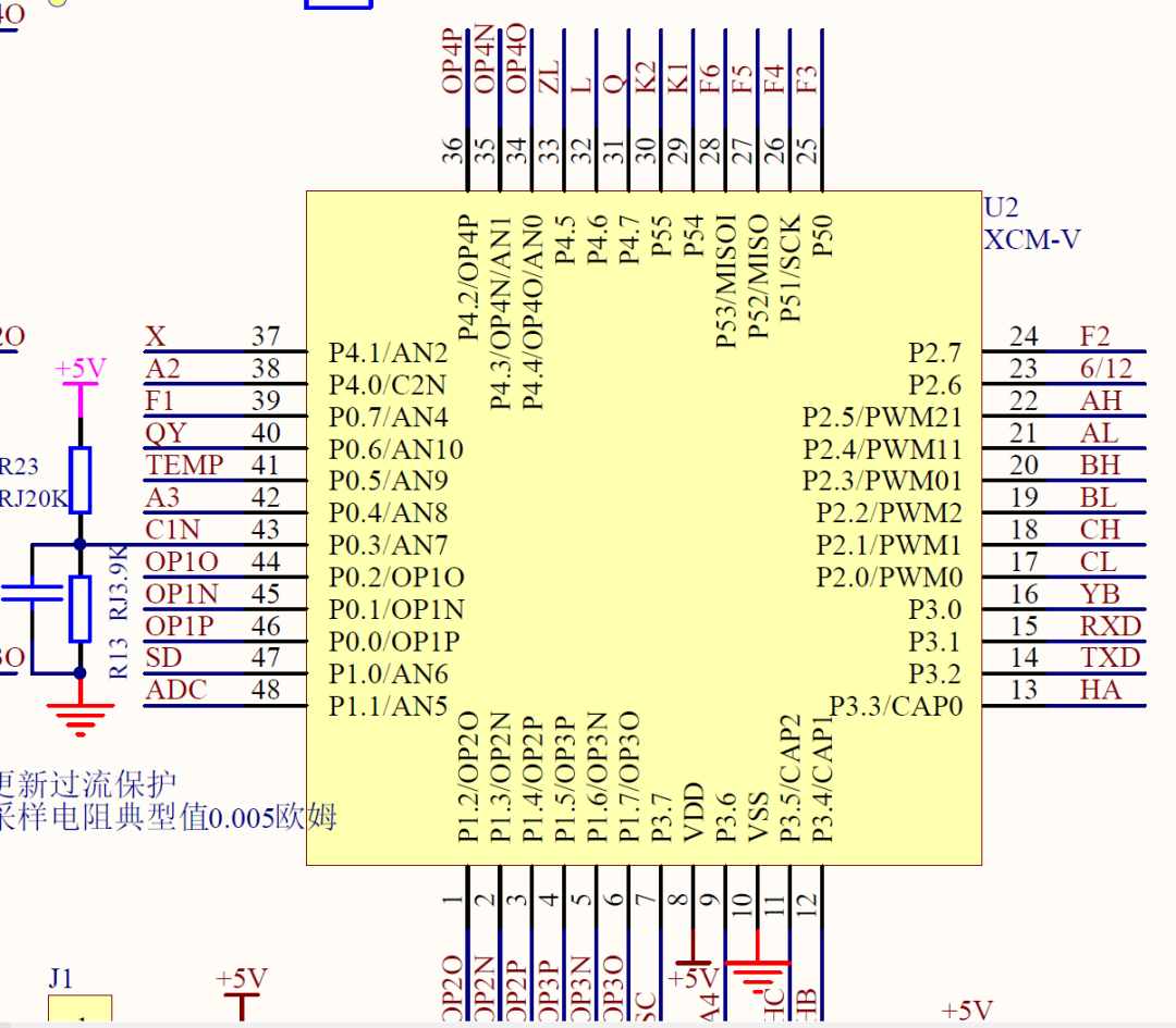 我从另一个控制器原理图上找到了,但是没有完整型号,大概搜了下应该是一颗8051内核的MCU,专门用在BLDC的控制上。