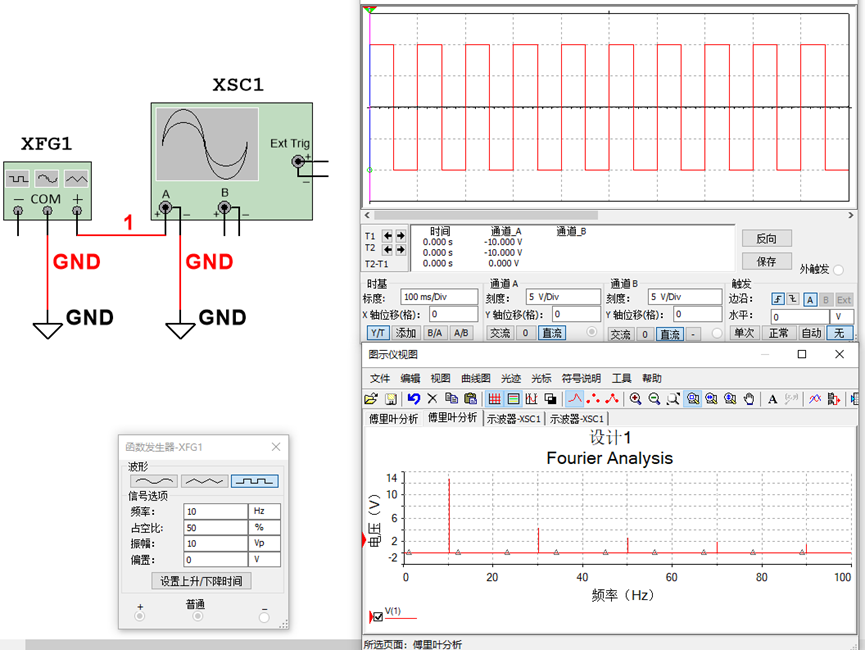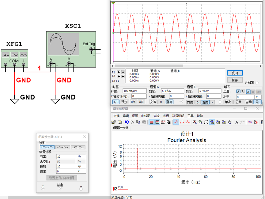 图3-1 是10v@10Hz的单频正弦信号10sin(2π10t)的时域波形和频域波形,示波器显示的是时域波形,是一个标准的正弦信号。而从频域上看,是一根谱线在10Hz位置的幅值是10V的信号,时域和频域描述的信息是一样的。
