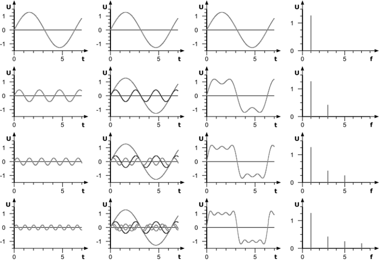 图3-3 中看起来更形象,第一行是一个频率等于方波基频的正弦信号,第二行中基波与三次谐波的叠加,已经可以看出类似于方波的波形了。第四行中,基波、三次、五次和七次谐波的叠加,更接近方波了。这也说明了,方波含有非常高频率的谐波,因此非常脏,而正弦信号,只有一根谱线,就很干净。
