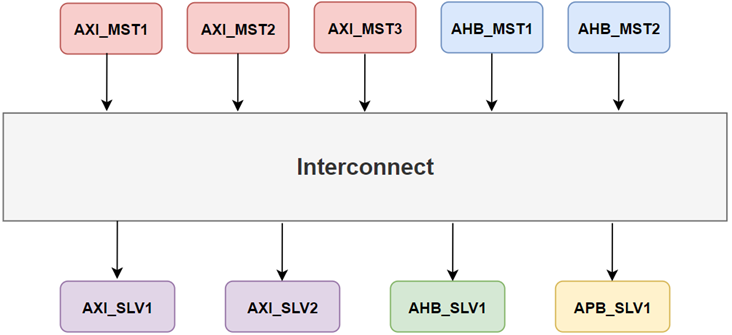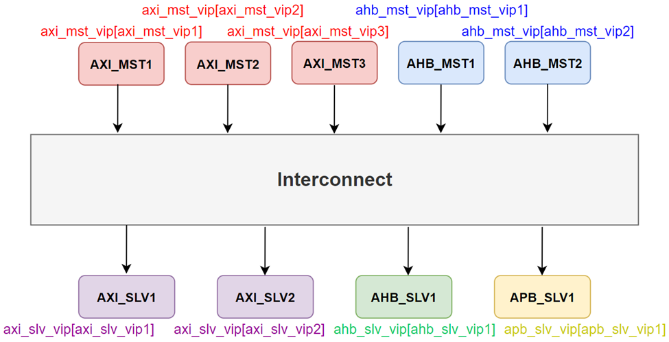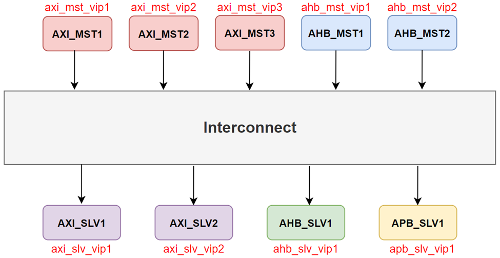 总线验证会涉及很多Masters和Slaves接口,少则十来个,多则成百上千个,每个口通常都需要挂接对应的VIP来产生激励,如下图示例,有5个Master VIP,4个Slave VIP。挂接的Master VIP用于发起激励,挂接的Slave VIP用于响应激励。在挂接如此众多的VIP验证环境汇总,需要有更高效且灵活的方法去控制每一个VIP激励行为。