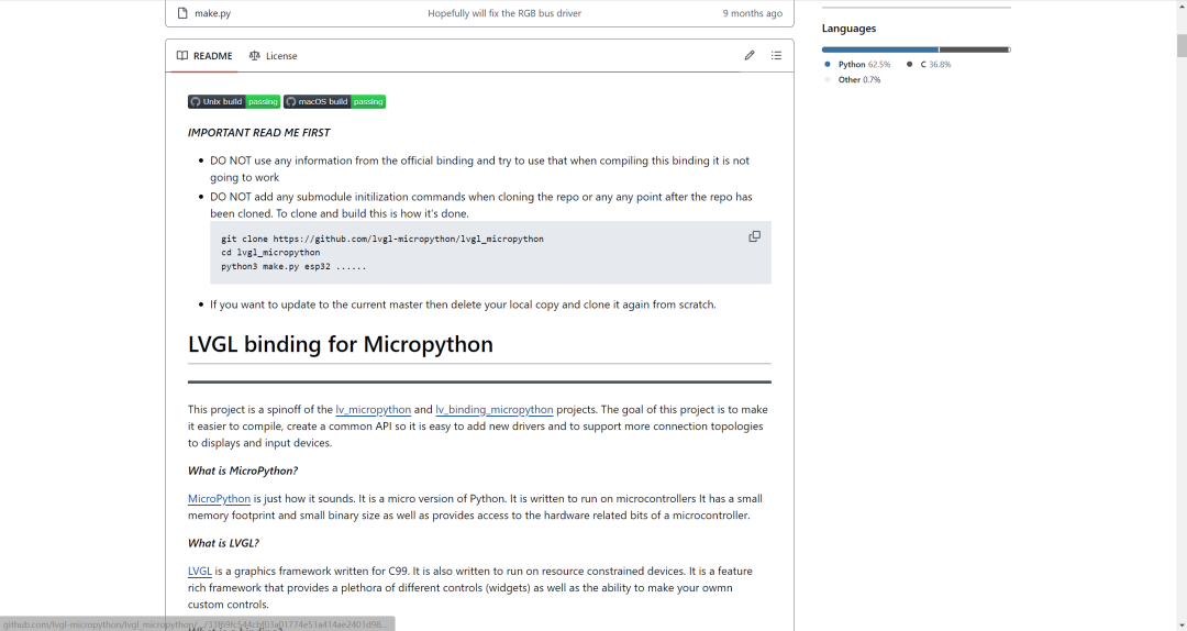 lv_micropython的git 子模块(方便分离维护核心库与绑定代码)。 - 构建