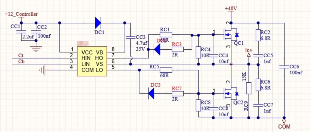 - 上电初始化电位上电瞬间三相 MOS 全关,相端电位未知,下拉电阻让相端初始为 0V,避免上电时电机误抖动。