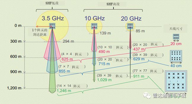 通过对相同单元数的这些结果的比较,可以看出:到达距离随着频率的升高而变短,但是即使在20 GHz的情况下,对于相同的天线尺寸,到达距离也不会显著减小。然而,虽然对于10 GHz频段中的100(10×10)单元天线,到达距离跳到490 m。