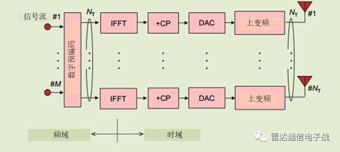 下图是采用正交频分复用(OFDM)典型大规模MIMO发射机的配置。这种发射机需要数模转换器(DAC)和与发射机天线元件相同数量的上变频器。类似地,它还要求基带处理电路执行逆快速傅里叶变换(IFFT),并将循环前缀(CP)作为信号处理附加到信号上,其数目与发射机天线单元的数目完全相同。
