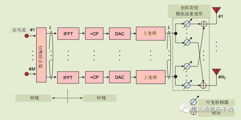 为了实现低成本的大规模MIMO发射机,已经对混合波束形成配置进行了研究,该混合波束形成配置将数字预编码和模拟波束形成相结合,如图所示。这种配置只将全数字配置中的波束形成过程移动到时域进行,并用射频电路中由可变移相器实现的模拟波束形成来代替。在这种混合波束形成配置中,只需对DAC和上变频器的波束数L值进行预处理,就可以减少IFFT过程的数量。