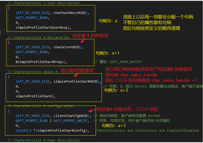 上面代码中 CCCD 的句柄为 char_value_handle+1, 这个大家通过上面的学习应该知道为什么了,这里结尾再通过文章开头的图说明一下 :
