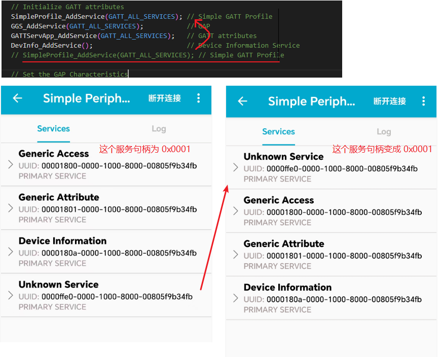 2、上面我们知道了服务的排列顺序:无强制要求,0x2800(服务声明)可以放在自定义服务后面,完全由从机代码决定;