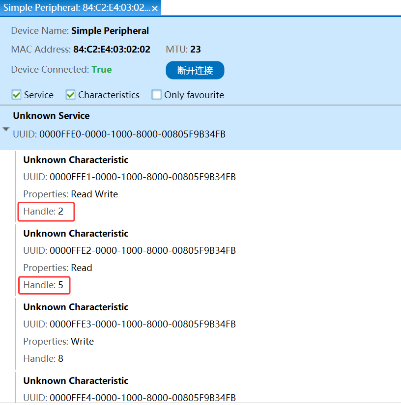 通过 PC 端的 BLE 调试工具可以看到句柄: